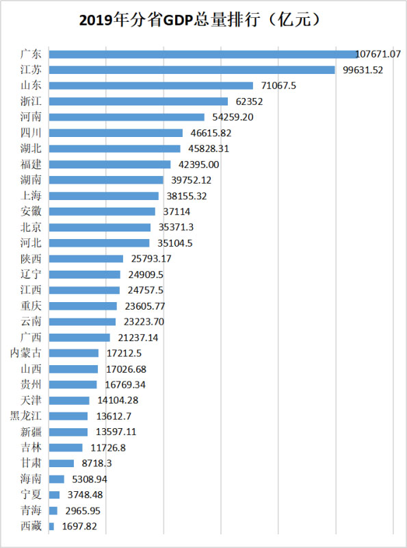 2019年全國分省GDP總量及其增速如上兩圖所示:從GDP總量看,廣東(107671.07億元)最高,西藏(1697.82億元)墊底;從GDP增速看,貴州最快,為8.3%,吉林墊底,增速僅3.0%。