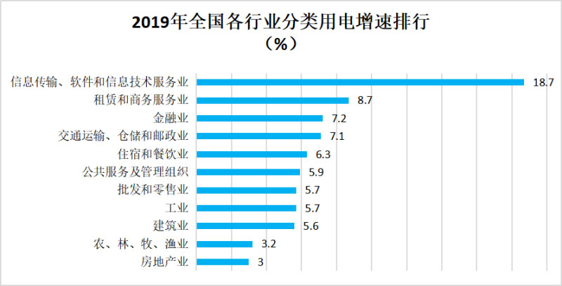 由上圖可見,2019年全國信息傳輸、軟件和信息技術服務業(yè)的用電增速最高,達18.7%,而房地產業(yè)用電增速最低,僅3%。