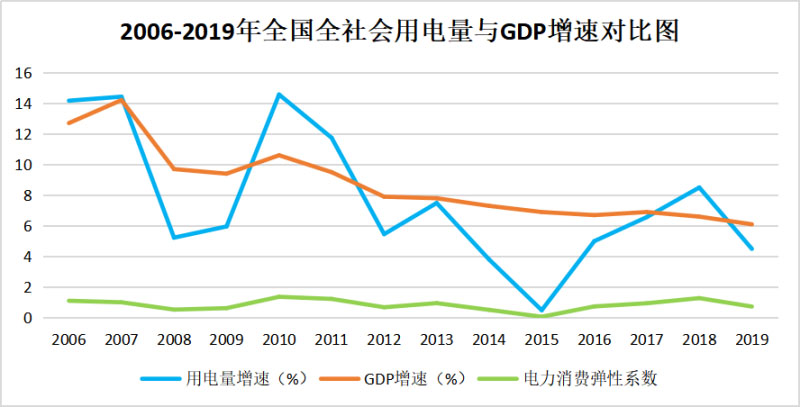 下圖是歷年我國全社會用電量與GDP增速對比圖。