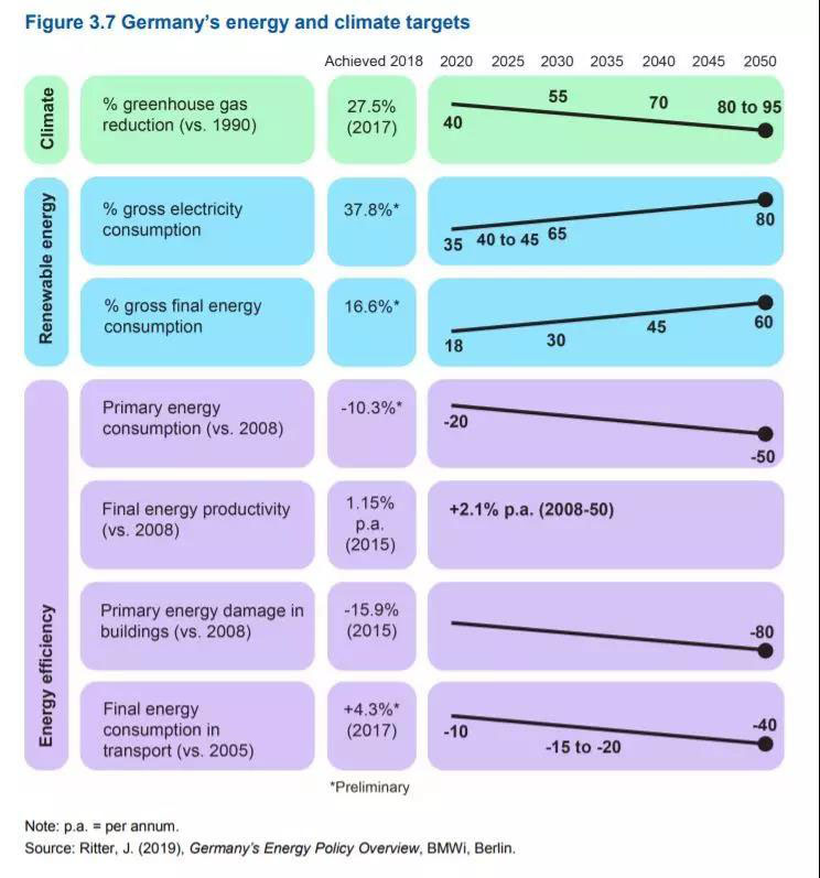 國際能源署發(fā)布德國能源政策評估報告,其中匯總了德國能源轉(zhuǎn)型各項目標(biāo)的進展數(shù)據(jù):