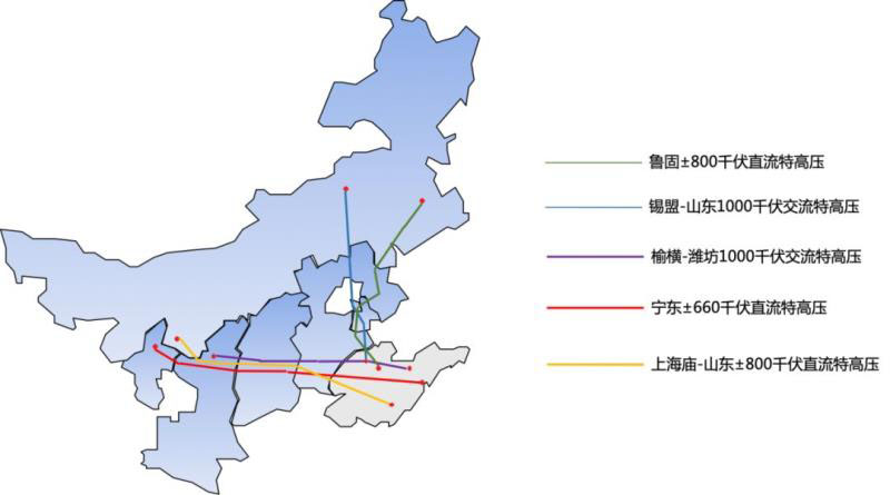 據(jù)國(guó)家統(tǒng)計(jì)局?jǐn)?shù)據(jù),山東省2017年和2018年全省電量平衡構(gòu)成如圖3所示。分析發(fā)現(xiàn),山東電源結(jié)構(gòu)以火力發(fā)電為主,可再生能源占比較低。除與華北網(wǎng)依靠省間聯(lián)絡(luò)線相連,山東還是多條特高壓線路的受端,如圖4所示。2018年,山東全社會(huì)用電量增速達(dá)到8.96%,凈外受電量同比增長(zhǎng)22%,域內(nèi)可再生能源發(fā)電量比例增速達(dá)到39%,可再生能源電力消納583.6億千瓦時(shí),其中域外可再生能源購(gòu)買量超過(guò)90億千瓦時(shí)??梢?jiàn),除進(jìn)一步發(fā)掘本省可再生資源稟賦外,履行可再生能源消納責(zé)任仍需要可再生能源大省的外送支持。