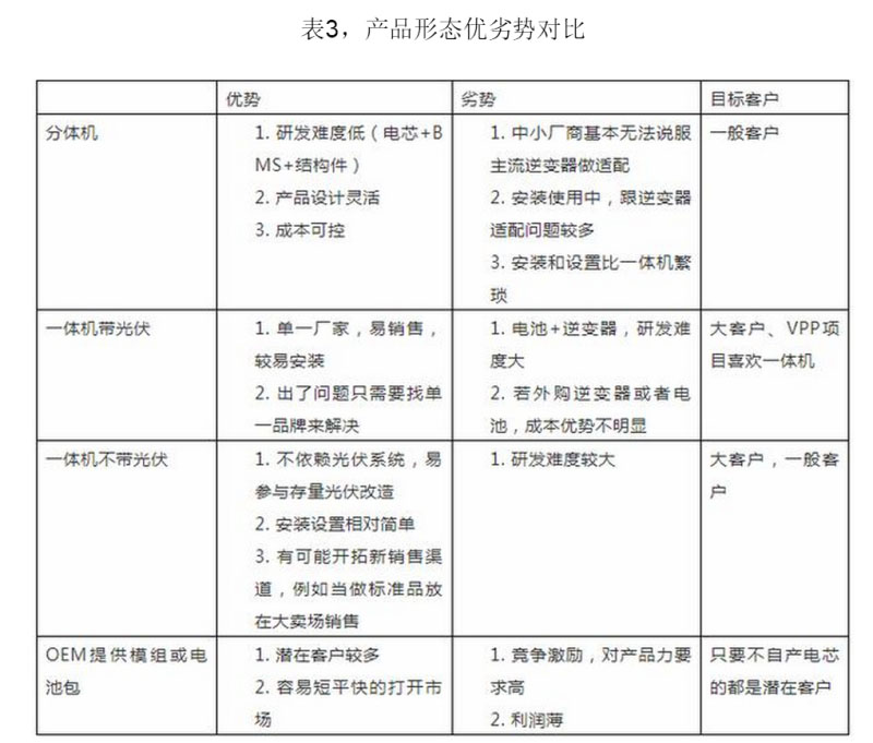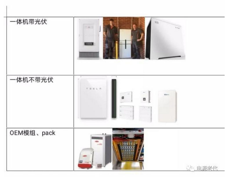 再來看產(chǎn)品路線。具體來說大致有四種:分體機(jī),一體機(jī)帶光伏,一體機(jī)不帶光伏,OEM提供模組或pack。市場上代表性的產(chǎn)品舉例如下: