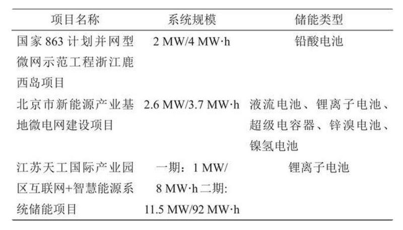 另外由于大工業(yè)用電的峰谷電價(jià)差相對(duì)于普通工商業(yè)峰谷電價(jià)差小,因此可通過峰谷套利與降低需量電費(fèi)相加的模式進(jìn)行盈利分析。為進(jìn)一步縮小成本提高收益,實(shí)現(xiàn)電池的充分利用,選用梯次電池代替新電池的儲(chǔ)能應(yīng)用模式逐漸推廣開來。2019年8月6日在深圳市比克工業(yè)園區(qū)投運(yùn)的2.15 MW/7.27 MW·h梯次電池儲(chǔ)能項(xiàng)目,采用三元及磷酸鐵鋰電池、兩充兩放的技術(shù)方案,實(shí)現(xiàn)削峰填谷、重要負(fù)荷應(yīng)急保障供電等功能。表6列舉了國內(nèi)目前已建成的部分儲(chǔ)能微電網(wǎng)項(xiàng)目。