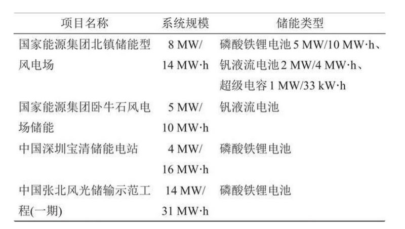相比于其他領(lǐng)域,儲(chǔ)能在新能源并網(wǎng)應(yīng)用中需要滿足一些特殊要求:由于新能源電站所處地理位置較為偏遠(yuǎn),儲(chǔ)能系統(tǒng)需滿足配置靈活、安裝方便、使用壽命長等特點(diǎn),以減少建設(shè)周期,并盡可能做到減少維護(hù)或免維護(hù);另外新能源電站環(huán)保要求較高,儲(chǔ)能電池、裝置在選擇時(shí)應(yīng)盡量具備綠色無污染等特點(diǎn)。儲(chǔ)能系統(tǒng)的放電以低倍率0.5 C、1 C為主,PCS接入方式以百千瓦級(jí)多機(jī)并聯(lián)經(jīng)過升壓接入6 kV或10 kV母線為主。目前,鋰離子電池或釩液流電池被公認(rèn)為該應(yīng)用領(lǐng)域的主要技術(shù)手段[17],其中磷酸鐵鋰電池市場占較高,而隨著三元鋰電池在電化學(xué)儲(chǔ)能項(xiàng)目中暴露出來與日增加的安全問題,越來越多的集成商逐漸避免采用三元鋰系電池。另外,超級(jí)電容在功率波動(dòng)平抑,鉛碳電池在棄風(fēng)、棄光回收等應(yīng)用場合也有應(yīng)用案例。表4中列舉了國內(nèi)具有代表性的大規(guī)模新能源并網(wǎng)項(xiàng)目。