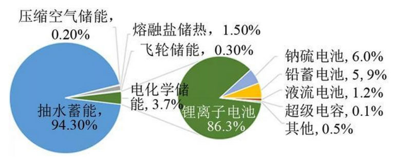據(jù)中關(guān)村儲(chǔ)能產(chǎn)業(yè)技術(shù)聯(lián)盟(CNESA)統(tǒng)計(jì),截至2018年底,全球已投運(yùn)儲(chǔ)能項(xiàng)目累計(jì)裝機(jī)規(guī)模為181.0 GW,同比增長3.2%[2,3]。電化學(xué)儲(chǔ)能裝機(jī)為6.6254 GW,同比增長126.4%,占比為3.7%,較上一年增長2.0個(gè)百分點(diǎn)。各類儲(chǔ)能具體占比如圖1所示。目前,中國已投運(yùn)儲(chǔ)能項(xiàng)目裝機(jī)規(guī)模31.3 GW,占全球市場的17.3%。其中,電化學(xué)儲(chǔ)能是除抽水蓄能外裝機(jī)規(guī)模最大的儲(chǔ)能形式[4],累計(jì)1072.7 MW。同時(shí),電化學(xué)儲(chǔ)能也是目前各類儲(chǔ)能應(yīng)用中,除抽水蓄能之外應(yīng)用最廣泛、技術(shù)發(fā)展最快、產(chǎn)業(yè)基礎(chǔ)最好的儲(chǔ)能技術(shù)。以鋰離子電池、鉛酸電池、液流電池為主導(dǎo)的電化學(xué)儲(chǔ)能不僅在電池本體技術(shù)和系統(tǒng)集成技術(shù)層面取得了重大突破,并且在發(fā)電領(lǐng)域的場景應(yīng)用范圍也實(shí)現(xiàn)了重要擴(kuò)展。因此本文主要針對(duì)電化學(xué)儲(chǔ)能相關(guān)政策、技術(shù)及其應(yīng)用予以闡述。