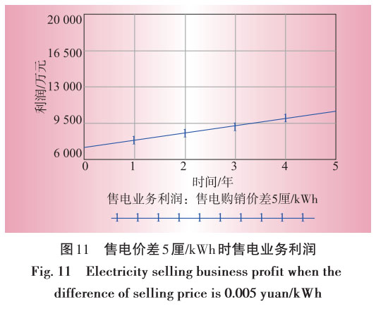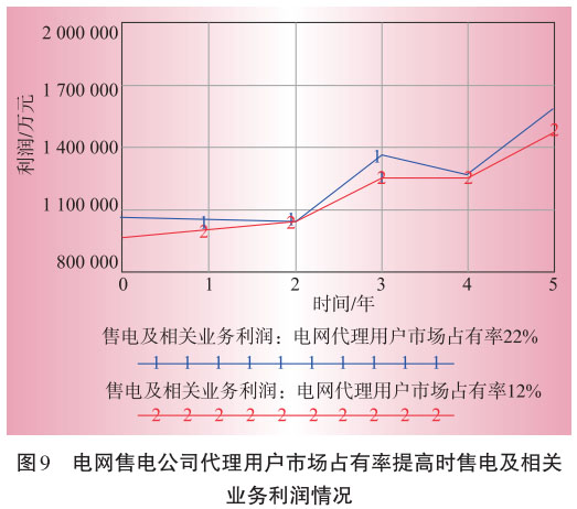 電網(wǎng)售電公司代理用戶電量通過市場(chǎng)占有率 來體現(xiàn)。假設(shè)電網(wǎng)企業(yè)大力開拓市場(chǎng),當(dāng)市場(chǎng)占有率從目前的12%提高到22%時(shí),售電及相關(guān)業(yè)務(wù)的利潤(rùn)如圖9。當(dāng)售電業(yè)務(wù)量增加,電網(wǎng)售電及相關(guān)業(yè)務(wù)的利潤(rùn)也同步上升。
