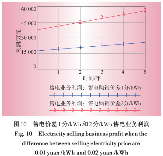 電網(wǎng)售電公司開展售電業(yè)務(wù),購(gòu)銷價(jià)差決定了售電業(yè)務(wù)的盈利水平,也是售電業(yè)務(wù)風(fēng)險(xiǎn)的最為重要來源。在設(shè)置初始模型時(shí),購(gòu)電價(jià)格和零售價(jià)格設(shè) 置了隨機(jī)函數(shù),購(gòu)銷價(jià)差平均價(jià)設(shè)定在2分/kWh。如果將隨機(jī)函數(shù)去除,假設(shè)購(gòu)銷價(jià)差分別固定 在1分錢/kWh和2分錢/kWh的水平,此時(shí)的模型模 擬結(jié)果如圖10。