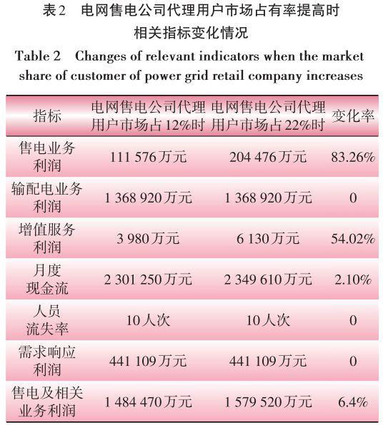 因電網(wǎng)售電公司代理用戶市場(chǎng)占有率提高10% 引起的其他有關(guān)指標(biāo)變化如表2。從表2中可以看出, 電網(wǎng)代理用戶的規(guī)模上升,售電業(yè)務(wù)利潤(rùn)提升明顯, 同時(shí)帶動(dòng)增值服務(wù)利潤(rùn)大幅提升,現(xiàn)金流也會(huì)有一定 程度增加,最終提升了售電及相關(guān)業(yè)務(wù)的利潤(rùn)水平。