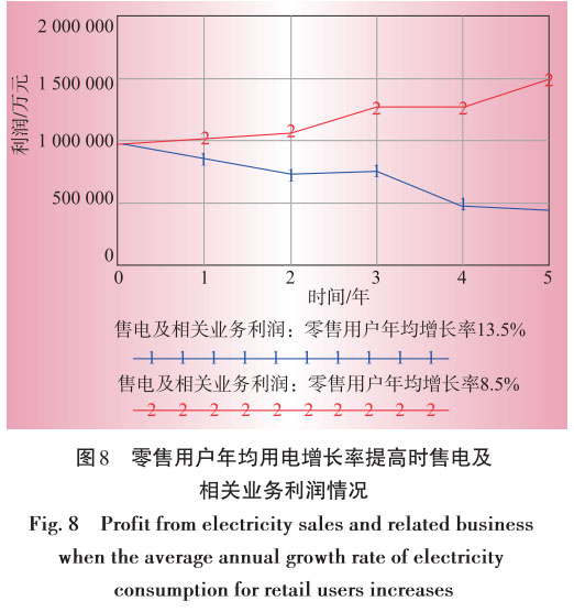 假設(shè)零售用戶年均用電增長(zhǎng)率為8.5%,直接交 易電量年均增長(zhǎng)率為7%,全社會(huì)年用電量增長(zhǎng)率 6.1%。圖8是零售用戶年均用電增長(zhǎng)率提高到 13.5%時(shí)(提高5%)的售電及相關(guān)業(yè)務(wù)指標(biāo)變化情 況,可以看出,如果按照目前市場(chǎng)價(jià)差體系,市場(chǎng)化交易電量越多,電網(wǎng)的利潤(rùn)將越少,而且隨著電量增加越多,售電相關(guān)業(yè)務(wù)利潤(rùn)下降越多。