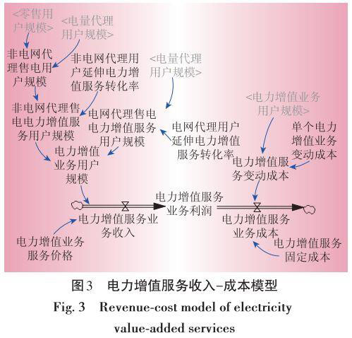 該模型包括電力增值服務(wù)的成本和收入2部 分?;镜倪壿嬍?隨著售電業(yè)務(wù)放開,售電公司紛紛切入電力增值服務(wù)業(yè)務(wù)。此時(shí),代理電力用戶售電對(duì)于優(yōu)先開發(fā)用戶的增值服務(wù)具有更高的轉(zhuǎn)化率。售電公司從事增值服務(wù),需要設(shè)備、人員等, 故成本包括固定成本和變動(dòng)成本。電力增值服務(wù)收入-成本模型如圖3。