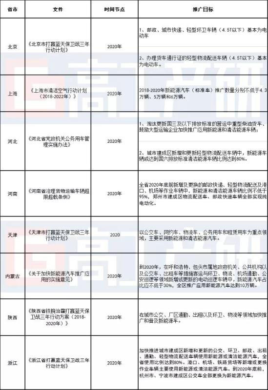 全國部分省市新能源物流車推廣目標(biāo)