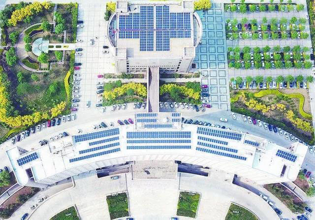 辦公樓頂由425塊太陽(yáng)能電池板組成的光伏項(xiàng)目,裝機(jī)容量300千瓦。