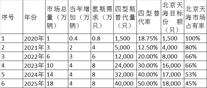 北京天海依據(jù)藍(lán)皮書的發(fā)展規(guī)劃,預(yù)測(cè)了氫燃料電池汽車的未來市場和預(yù)計(jì)的氫瓶未來市場容量如下表所示:
