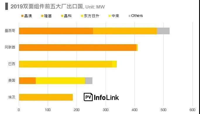 2019雙面組件出口總量為2.7GW,出口排名前三分別為墨西哥、阿聯(lián)酋、巴西,另外美國在十月雙面組件排除201之后,2019累積出口量躍升至337MW,全年排名位居第四,勝過輸往埃及的出口量。