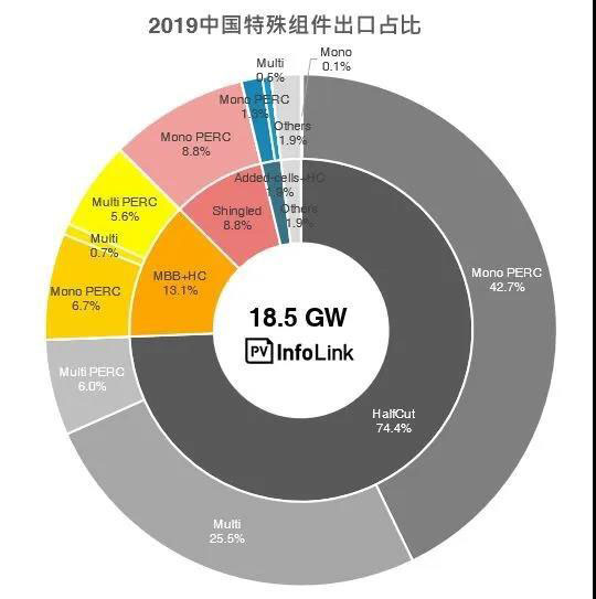 與2018年相比,2019年特殊組件出口總量從2.5GW擴(kuò)增至18.5GW,半片出口從2.1GW增加至13GW,新增了MBB+HC組件技術(shù)出口2.4GW,疊瓦由0.3GW提升至1.6GW,2019年除了半片以外,其他組件技術(shù)出口占比也提升,由此可見特殊組件的市場(chǎng)需求蓬勃且技術(shù)種類更多元。