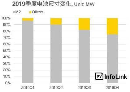 2019年雖仍是以M2(156.75mm)尺寸的組件出口為主,占全年出口量的86%,不過以G1(158.75mm)尺寸出口之組件,全年占比達(dá)13%。G1以外的其他大尺寸組件雖然占比不高,但可以看出逐季攀升的態(tài)勢(shì),可見2019海外市場(chǎng)對(duì)于大尺寸組件需求逐漸提高。