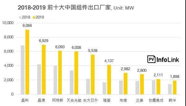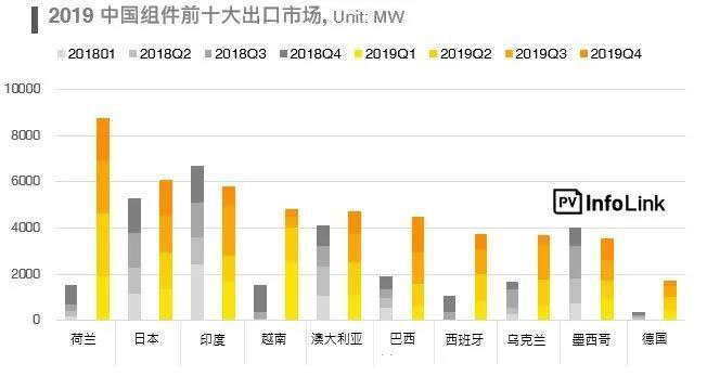 根據(jù)PV InfoLink 海關(guān)出口報(bào)告顯示,2019年中國本土組件累計(jì)出口66.8 GW,相較于2018年累積出口41.3 GW,成長了六成。受惠于2018年8月歐洲MIP取消,中國組件可直接輸歐,以及越南630項(xiàng)目搶裝、中南美與中東等新興市場(chǎng)政策與項(xiàng)目的支持,2019年海外市場(chǎng)需求良好。