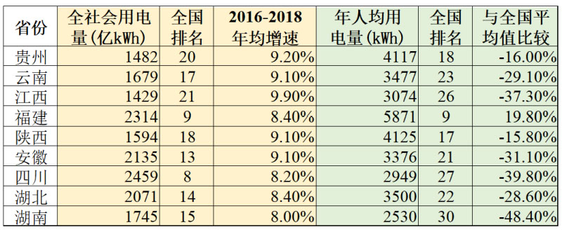 2015至2018年,我國(guó)電力消費(fèi)彈性系數(shù)從0.42增長(zhǎng)到1.29,地方經(jīng)濟(jì)發(fā)展對(duì)電能保障的依賴性日益強(qiáng)化。廣東、江蘇、山東、浙江既是GDP前四省份,也是全國(guó)用電量前四大省,且保持了一定用電增速。貴州、云南、江西、福建、陜西、安徽、四川、湖南、湖北等GDP增長(zhǎng)較快(超過7.5%)省份,近年用電量增速均超過8%(全國(guó)均值7.5%)。電能對(duì)這些省份經(jīng)濟(jì)發(fā)展的保障作用更加突出。
