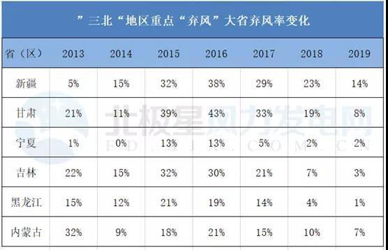 從數(shù)據(jù)來看,2019年棄風(fēng)率超過5%的地區(qū)僅有3個省份,3省棄風(fēng)電量占全國棄風(fēng)電量的 81%,新疆的棄風(fēng)率降至14.0%、甘肅的棄風(fēng)率降至7.6%、內(nèi)蒙古的棄風(fēng)率降至7.1%,遠(yuǎn)低于20%的紅色預(yù)警線。相關(guān)橙色區(qū)域內(nèi)蒙、河北等地棄風(fēng)率均下降到10%。