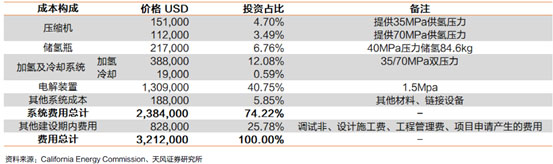 制氫裝置是這類(lèi)加氫站中成本最高的組件,例如水電解站使用的是電解裝置,成本約占加氫站總投資40%。