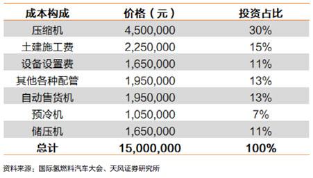 不同類(lèi)型的加氫站建造成本差異較大,我國(guó)建設(shè)的加氫站以高壓氫氣加氫站為主,造價(jià)大約在1500萬(wàn)元,近期有所下降。
