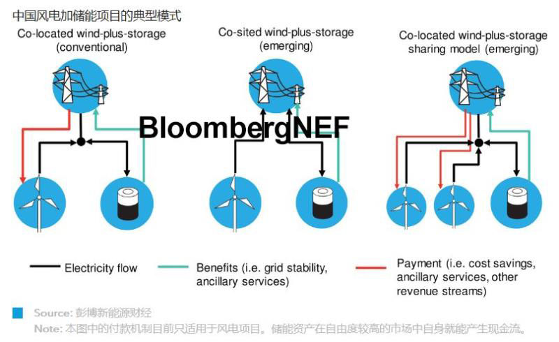 風(fēng)電+儲(chǔ)能領(lǐng)域浮現(xiàn)了多種商業(yè)模式。目前,多數(shù)風(fēng)電+儲(chǔ)能項(xiàng)目是在同一接入點(diǎn)接入電網(wǎng)。在一些較新的模式中,風(fēng)電和儲(chǔ)能是分別并網(wǎng)的。某些情況下,儲(chǔ)能系統(tǒng)由多個(gè)可再生能源項(xiàng)目共同使用,這樣的模式之下,多個(gè)項(xiàng)目開發(fā)商可分?jǐn)們?chǔ)能成本及風(fēng)險(xiǎn),并提高儲(chǔ)能資產(chǎn)利用率。
