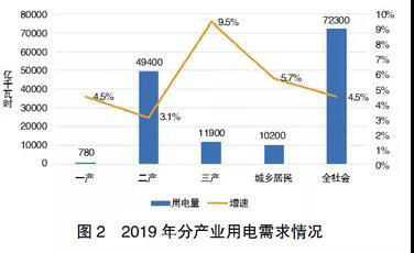 分產(chǎn)業(yè)來(lái)看,第三產(chǎn)業(yè)和城鄉(xiāng)居民用電成為拉動(dòng)用電需求的主力軍(見(jiàn)圖2)。2019年第一產(chǎn)業(yè)用電量為780億千瓦時(shí),同比增長(zhǎng)4.5%,保持平穩(wěn)增長(zhǎng);2019年第二產(chǎn)業(yè)用電量4.94萬(wàn)億千瓦時(shí),同比增長(zhǎng)3.1%,占全社會(huì)用電量的比重同比降低0.9個(gè)百分點(diǎn);2019年第三產(chǎn)業(yè)用電量1.19萬(wàn)億千瓦時(shí),同比增長(zhǎng)9.5%,2019年城鄉(xiāng)居民生活用電量1.02萬(wàn)億千瓦時(shí),同比增長(zhǎng)5.7%,第三產(chǎn)業(yè)和城鄉(xiāng)居民生活用電分別拉動(dòng)全社會(huì)用電量增長(zhǎng)1.5和0.8個(gè)百分點(diǎn),合計(jì)拉動(dòng)2.3個(gè)百分點(diǎn),高于第二產(chǎn)業(yè)拉動(dòng)的2.1個(gè)百分點(diǎn)。第三產(chǎn)業(yè)和城鄉(xiāng)居民生活用電量對(duì)全社會(huì)用電量增長(zhǎng)的貢獻(xiàn)率合計(jì)達(dá)到51.0%,比第二產(chǎn)業(yè)對(duì)全社會(huì)用電量增長(zhǎng)的貢獻(xiàn)率高3.8個(gè)百分點(diǎn),其中第三產(chǎn)業(yè)貢獻(xiàn)率提高尤為明顯,為10.1個(gè)百分點(diǎn)。