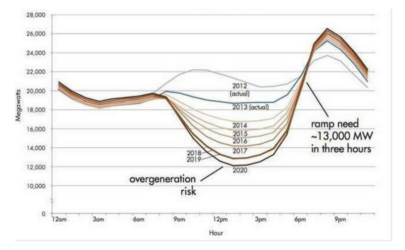 下圖是美國加州近幾年來“鴨子曲線”的演變,隨著光伏裝機(jī)容量的逐年迅速上升,“鴨子曲線”將越來越明顯。