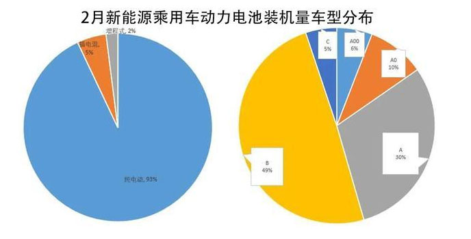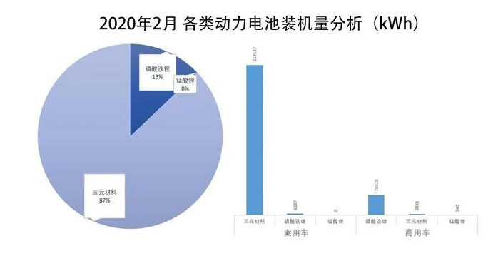 不過造成這一結(jié)果的原因,恐怕是因2月份商用車動力電池裝機(jī)量大幅減少所致。在商用車中,2月份磷酸鐵鋰電池裝機(jī)量達(dá)到92%,而商用車動力電池裝機(jī)量卻環(huán)比下降約88%。三元材料電池則占據(jù)乘用車動力電池裝機(jī)量的近99%,2月份乘用車動力電池裝機(jī)量環(huán)比下滑約70%。