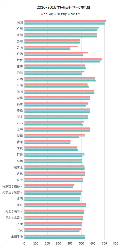 如圖11所示,全國居民用電平均電價兩年來略有上漲,而深圳、廣州、廣東、福建、北京等人均收入較高的地市卻有所下降,同時,四川、蒙東等地也有所下降。