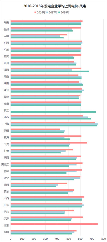 如圖6所示,北京、上海、浙江的風(fēng)電上網(wǎng)電價均超過700元/MWh。