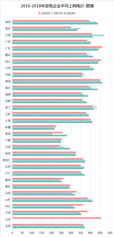 如圖4所示,2017年中,因國家發(fā)改委發(fā)布《關(guān)于取消、降低部分政府性基金及附加合理調(diào)整電價結(jié)構(gòu)的通知》,自2017年7月1日起,取消向發(fā)電企業(yè)征收的工業(yè)企業(yè)結(jié)構(gòu)調(diào)整專項資金,騰出的電價空間用于提高燃煤電廠標桿電價,緩解燃煤發(fā)電企業(yè)經(jīng)營困難,2016-2018年全國燃煤平均上網(wǎng)電價有所增長。其中,青海、甘肅、湖北三地2018年平均上網(wǎng)電價較2017年漲幅最為顯著。
