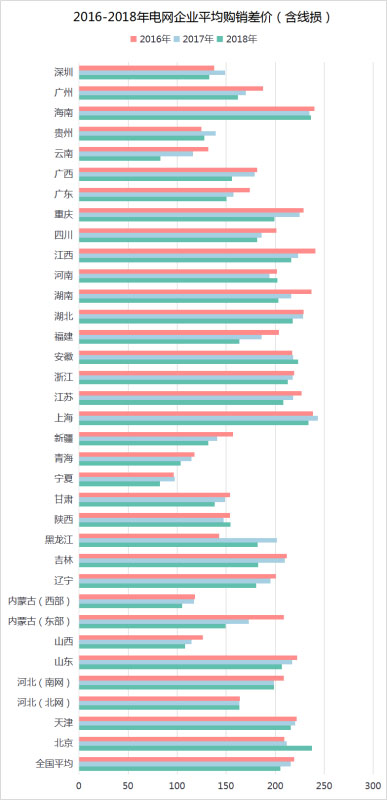 圖2 2016-2018年電網(wǎng)企業(yè)平均購銷差價(含線損)