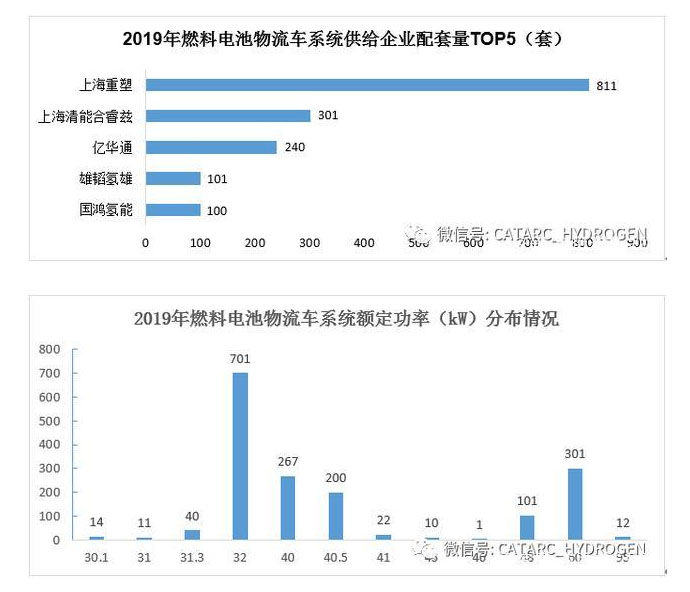 燃料電池系統(tǒng)在整車成本中占比較高,系統(tǒng)供給企業(yè)在產(chǎn)業(yè)鏈上占據(jù)重要位置。2019年,上海重塑、上海清能合睿茲、億華通、雄韜氫雄、國鴻氫能等系統(tǒng)企業(yè)在燃料電池物流車上裝配量排在前列,其中上海重塑占據(jù)半數(shù)市場份額,競爭優(yōu)勢明顯。我國燃料電池物流車普遍采用“燃料電池-鋰電池” 混合技術(shù)路線,2019年燃料電池系統(tǒng)額定功率主要集中在32 kW、40 kW、40.5 kW和60kW,12月配套系統(tǒng)中,40kW及以上產(chǎn)品成為主流,高功率發(fā)展趨勢明顯。