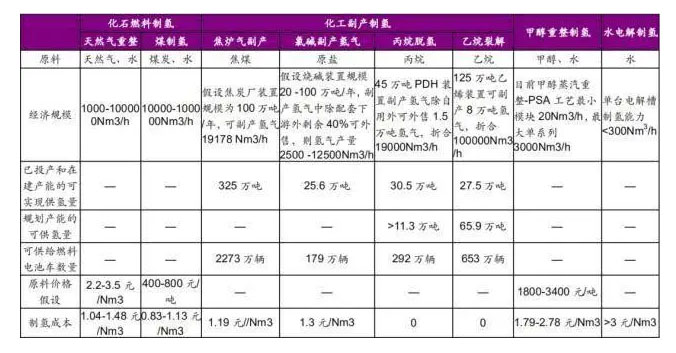 (1)從出廠成本來看,焦?fàn)t氣、氯堿、丙烷脫氫制丙烯和乙烷裂解制烯烴副產(chǎn)的粗氫氣可以經(jīng)過脫硫、變壓吸附和深冷分離等精制工序后作為燃料電池車用氫源,成本遠(yuǎn)低于化工燃料制氫、甲醇重整制氫和水電解制氫等路線。