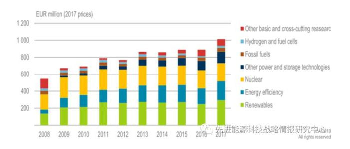 為了推動“能源轉型”戰(zhàn)略的發(fā)展,德國持續(xù)增加對能源技術研發(fā)的公共投入,2017年,德國投入10.1億美元用于能源相關的研究、開發(fā)和示范(RD&D),占其GDP的0.031%,相比前一年增長了14%。其中,可再生能源技術占能源RD&D總預算的29%,主要用于太陽能和風能研究;其次是能效(主要用于提高工業(yè)能效)和核能(包括核聚變),分別占22%和21%;其他電力和儲能技術占到13%,化石燃料僅占5%,其中一半以上用于碳捕集和利用的研究。此外,德國各州也投入資金支持能源技術研究,2016年德國各州的支出總額超過了2.48億歐元。