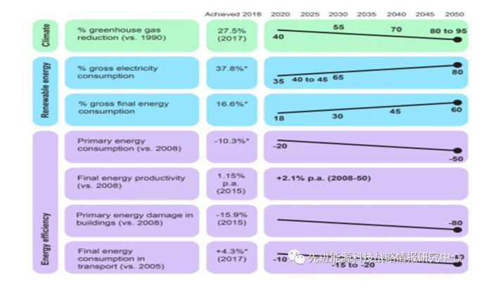 可再生能源是德國能源轉型的核心,根據其歐盟義務以及國家政策和立法制定了一套完善的短、中、長期可再生能源目標,包括:到2020年可再生能源在終端能源消費中占比18%,在發(fā)電量中占比35%;到2030年可再生能源在終端能源消費中占比30%,在發(fā)電量中占比65%;到2050年可再生能源在終端能源消費中占比60%,在發(fā)電量中占比80%。
