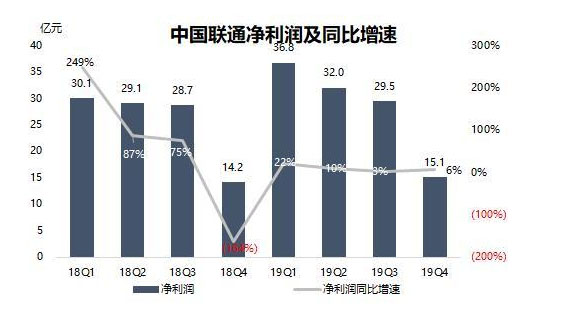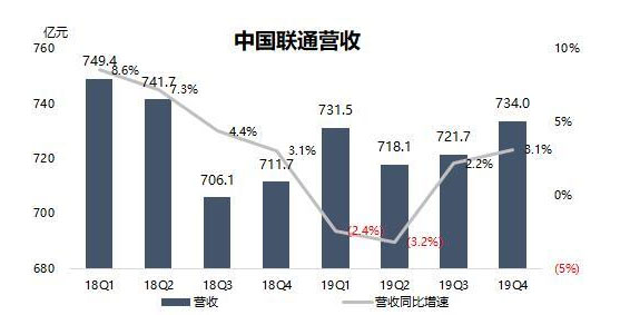 根據(jù)年度數(shù)據(jù)計算可得,2019年第四季度,中國聯(lián)通實現(xiàn)營收734億元,同比增長3.1%,高于彭博一致預期的731.97億元。公司權益持有者應占盈利為15.1億元,同比增長6%,但低于彭博一致預期的22.07億元。