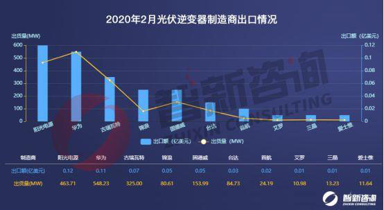 2020年2月,光伏逆變器出口總出貨量達2.4GW,出口總金額0.85億美元。企業(yè)出口金額方面,陽光電源出口金額0.12億美元(不含印度工廠),排名第一,華為出口金額0.11億美元,古瑞瓦特出口金額0.07億美元,排名第三。(注:企業(yè)出貨量與出口額數(shù)據(jù)為中國工廠生產(chǎn)并出口到國外的數(shù)據(jù),不包含海外工廠及保稅區(qū)。)