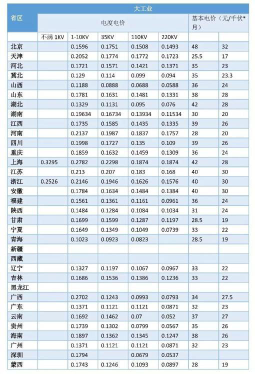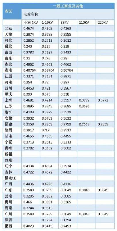 不同用電戶的銷售電價(jià)差異很大,工商業(yè)電價(jià)、大工業(yè)電價(jià)、居民電價(jià)均為電網(wǎng)的銷售電價(jià),全國的平均水平如下表。