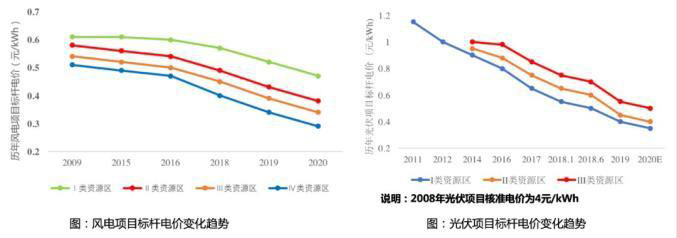 2019年之前,風(fēng)電和光伏項(xiàng)目采用標(biāo)桿電價(jià)政策,標(biāo)桿電價(jià)逐年下降;不同時(shí)間并網(wǎng)的項(xiàng)目電價(jià)不同,具體如下圖所示;