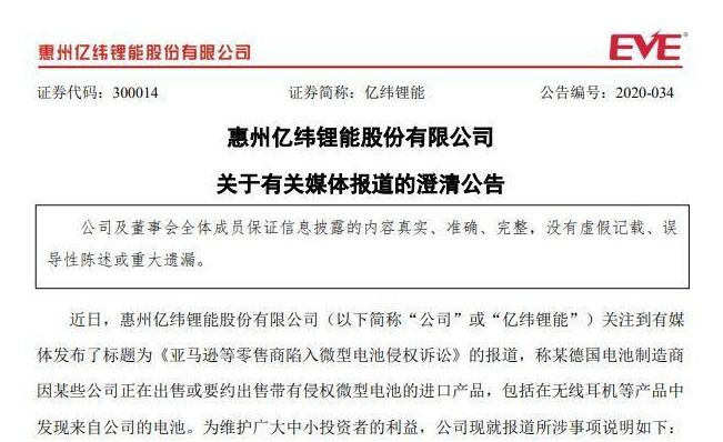 針對媒體報道涉及事項,億緯鋰能還介紹,2020年1月,某德國電池公司在德國慕尼黑法院對公司客戶提起專利侵權訴訟。公司應客戶需求,提供了公司豆式電池與涉案專利具有實質性區(qū)別的不侵權證詞。后該德國電池公司撤回該訴訟。