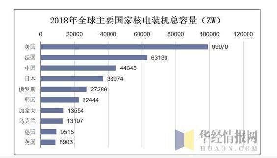 2019年,全球共有442臺核電機(jī)組可運行,凈裝機(jī)容量為392.4GWe,54臺機(jī)組在建。目前在運核電機(jī)組裝機(jī)容量排名前五的國家分別是美國、法國、中國、日本、俄羅斯,中國排名第三。根據(jù)國際原子能機(jī)構(gòu)及中國核能行業(yè)協(xié)會的統(tǒng)計,截至2018年12月31日,中國核能裝機(jī)容量位列全球第3位。