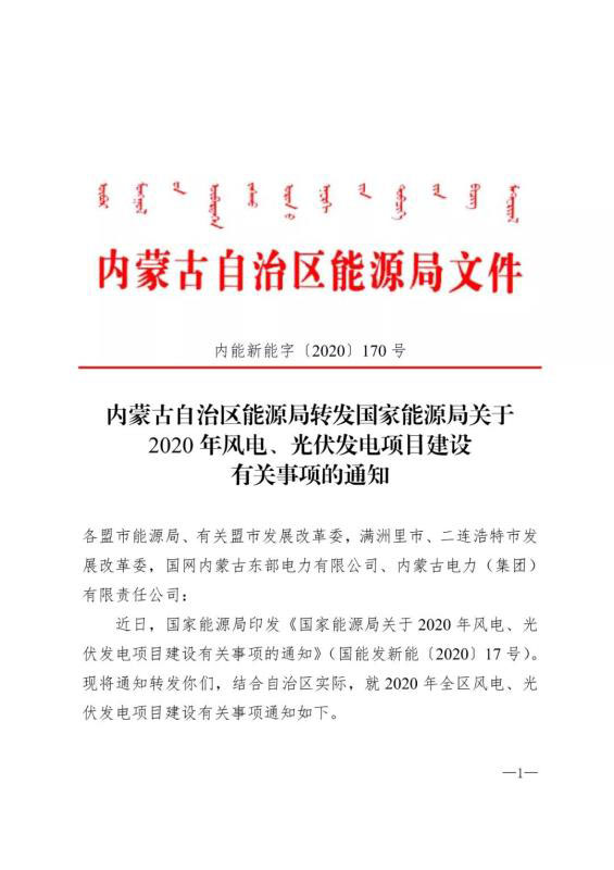 近日,國家能源局發(fā)布了《國家能源局關(guān)于2020年風(fēng)電、光伏發(fā)電項(xiàng)目建設(shè)有關(guān)事項(xiàng)的通知》(國能發(fā)新能[2020]17號(hào),以下簡稱17號(hào)文件),為抓好內(nèi)蒙古自治區(qū)2020年風(fēng)電和光伏發(fā)電行業(yè)管理,持續(xù)推動(dòng)內(nèi)蒙古自治區(qū)風(fēng)電、光伏發(fā)電科學(xué)有序健康發(fā)展,內(nèi)蒙古自治區(qū)能源局將國家能源局通知轉(zhuǎn)發(fā)各盟市,并結(jié)合自治區(qū)發(fā)展實(shí)際,提出了2020年風(fēng)電和光伏發(fā)電項(xiàng)目建設(shè)的具體要求。