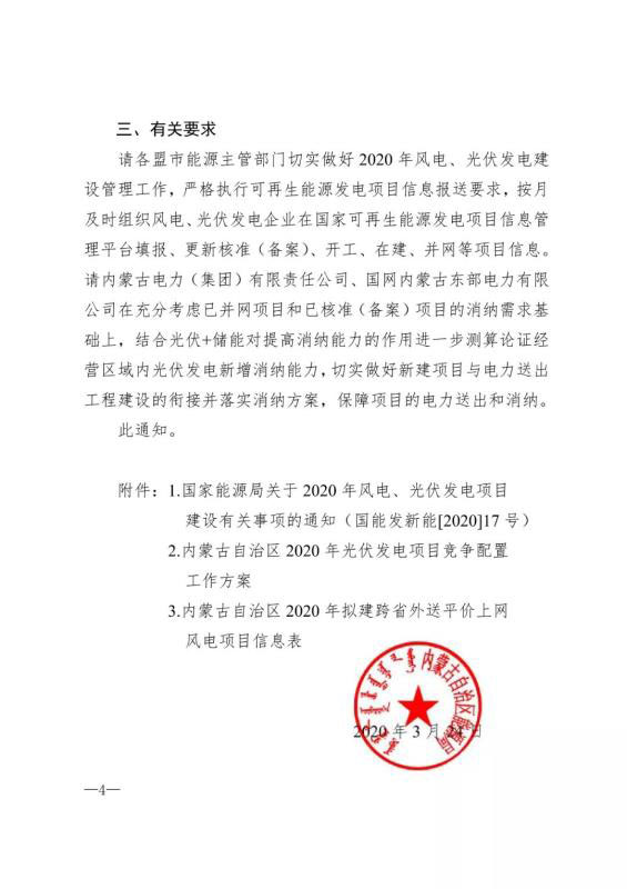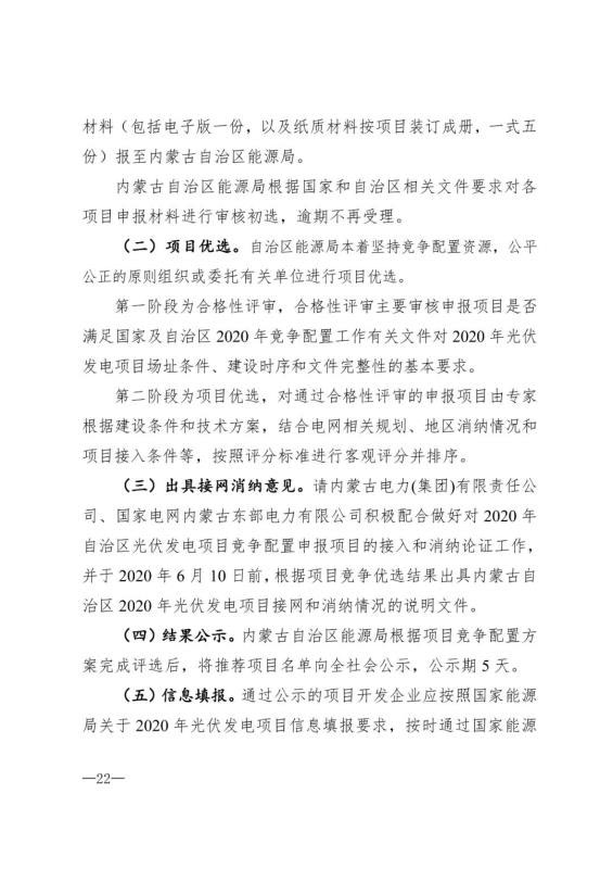 國家能源局要求各?。▍^(qū)、市)能源主管部門于2020年6月15日(含)前按相關(guān)要求將2020年擬新建的補(bǔ)貼競價(jià)項(xiàng)目、申報(bào)上網(wǎng)電價(jià)及相關(guān)信息報(bào)送國家能源局??紤]到在上報(bào)國家之前還要履行項(xiàng)目優(yōu)選、對(duì)外公示等工作環(huán)節(jié),要求各盟市能源主管部門于2020年5月20日前將擬新建的補(bǔ)貼競價(jià)項(xiàng)目報(bào)送內(nèi)蒙古自治區(qū)能源局。