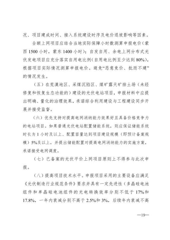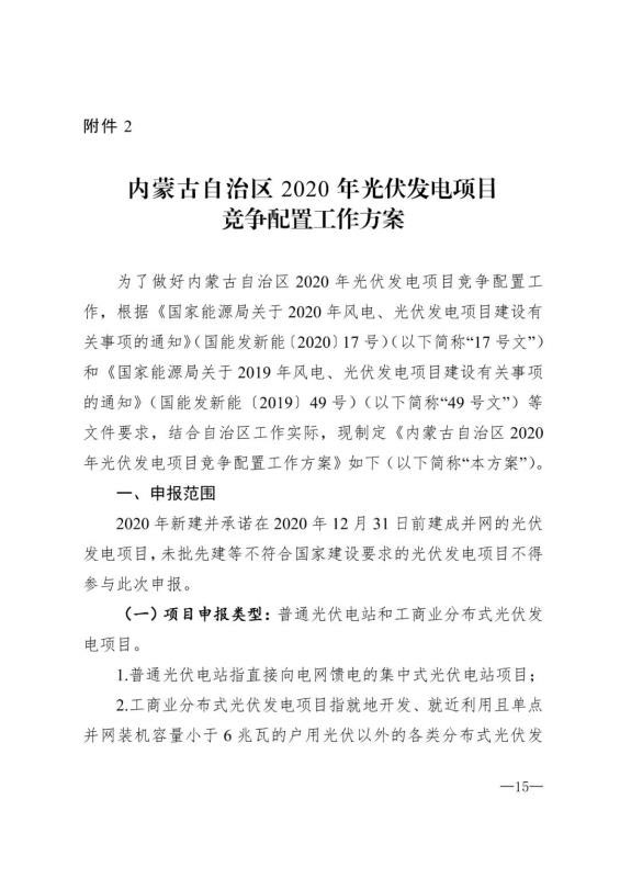 根據(jù)內(nèi)蒙古自治區(qū)黨委十屆十一次全委會(huì)暨全區(qū)經(jīng)濟(jì)工作會(huì)議精神,2020年光伏發(fā)電競價(jià)項(xiàng)目支持在荒漠地區(qū)、采煤沉陷區(qū)、露天煤礦排土場建設(shè)光伏電站;支持利用建筑物屋頂及工業(yè)園區(qū)等建設(shè)以自發(fā)自用為主的工商業(yè)分布式電站,工商業(yè)分布式光伏發(fā)電項(xiàng)目支持全部自發(fā)自用和余電上網(wǎng)兩類項(xiàng)目,其中余電上網(wǎng)項(xiàng)目上網(wǎng)電量比例不高于20%;優(yōu)先支持光伏+儲(chǔ)能項(xiàng)目建設(shè)。