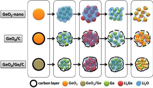 上圖為不同材料的鋰化反應(yīng)機(jī)制的示意圖。其中GeO2在GeO2-nano,GeO2/C以及GeO2/Ge/C中可逆反應(yīng)機(jī)制如圖所示。GeO2 納米結(jié)構(gòu)是轉(zhuǎn)換反應(yīng)的必要條件,而碳涂層可提高轉(zhuǎn)換反應(yīng)的可逆性,GeO2/Ge/C中Ge元素粒子對于提高GeO2轉(zhuǎn)換反應(yīng)可逆性起到了至關(guān)重要的作用。