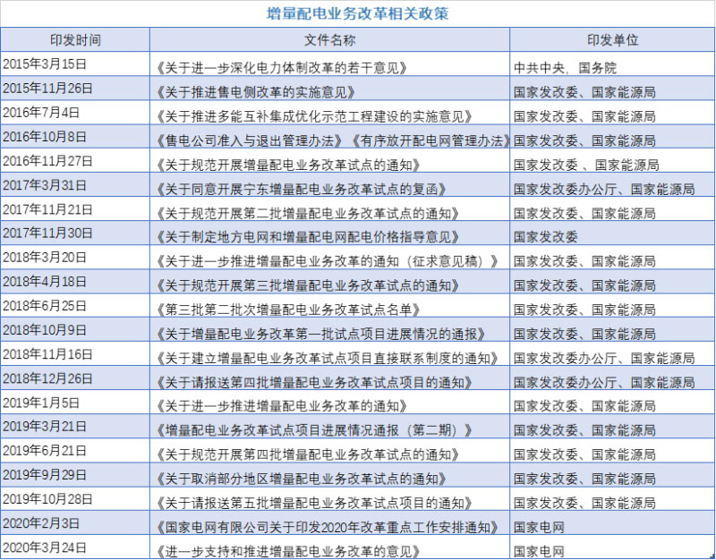 增量配電業(yè)務(wù)改革發(fā)軔于2015年。當年3月,中共中央、國務(wù)院聯(lián)合發(fā)布《進一步深化電力體制改革的若干意見》,提出增量配電業(yè)務(wù)改革。