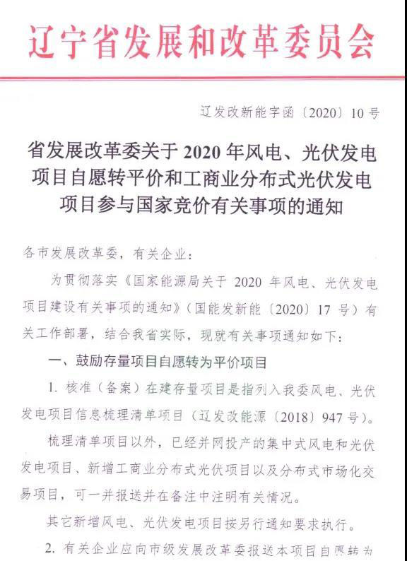 近日,遼寧省發(fā)改委發(fā)布《關于2020年全省風電、光伏有關事項通知》,主要內容有兩條:鼓勵存量項目自愿轉為平價項目、支持工商業(yè)分布式光伏發(fā)電項目參與國家競價!