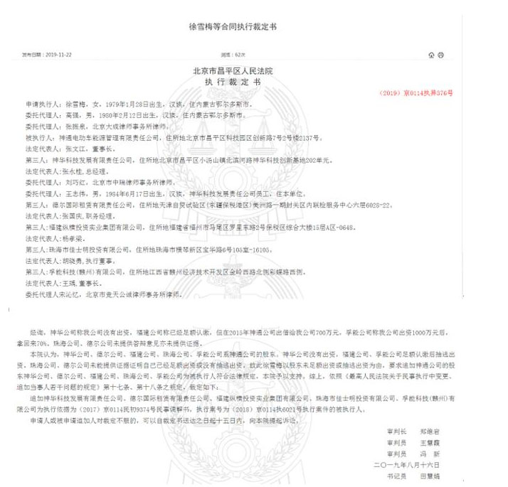 工商資料顯示,神通電動(dòng)車2016年至今失信信息多達(dá)10條以上。其中之一的北京市昌平區(qū)人民法院(2019)京0114執(zhí)異376號(hào)《徐雪梅等合同執(zhí)行裁定書(shū)》顯示,作為股東之一,孚能科技出資1000萬(wàn)元后,拿回了70%,即實(shí)際出資僅300萬(wàn)元。法院認(rèn)定孚能公司存在抽逃出資的行為,被追加為上述執(zhí)行案件的被執(zhí)行人。